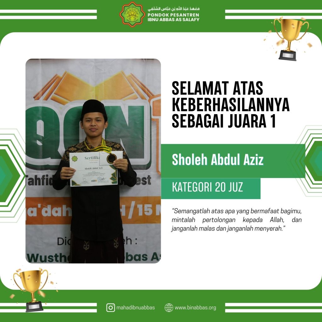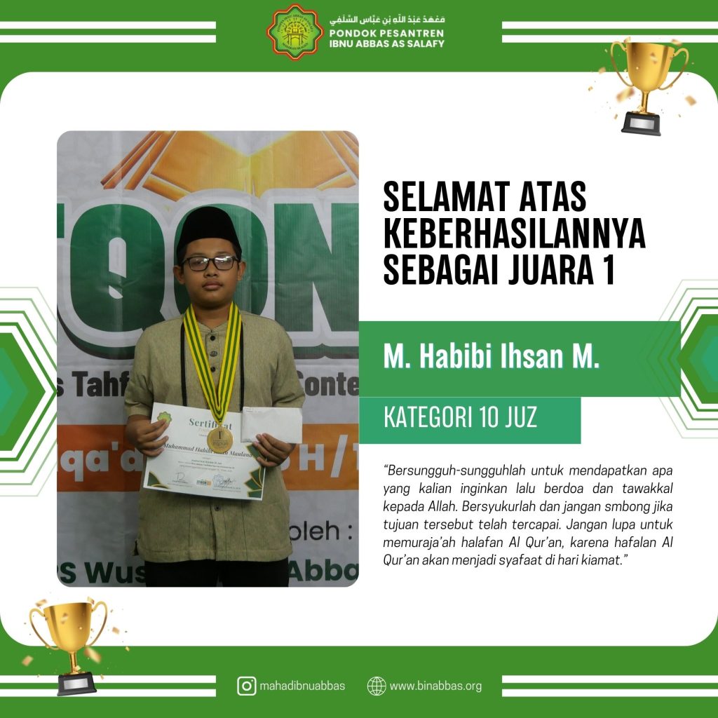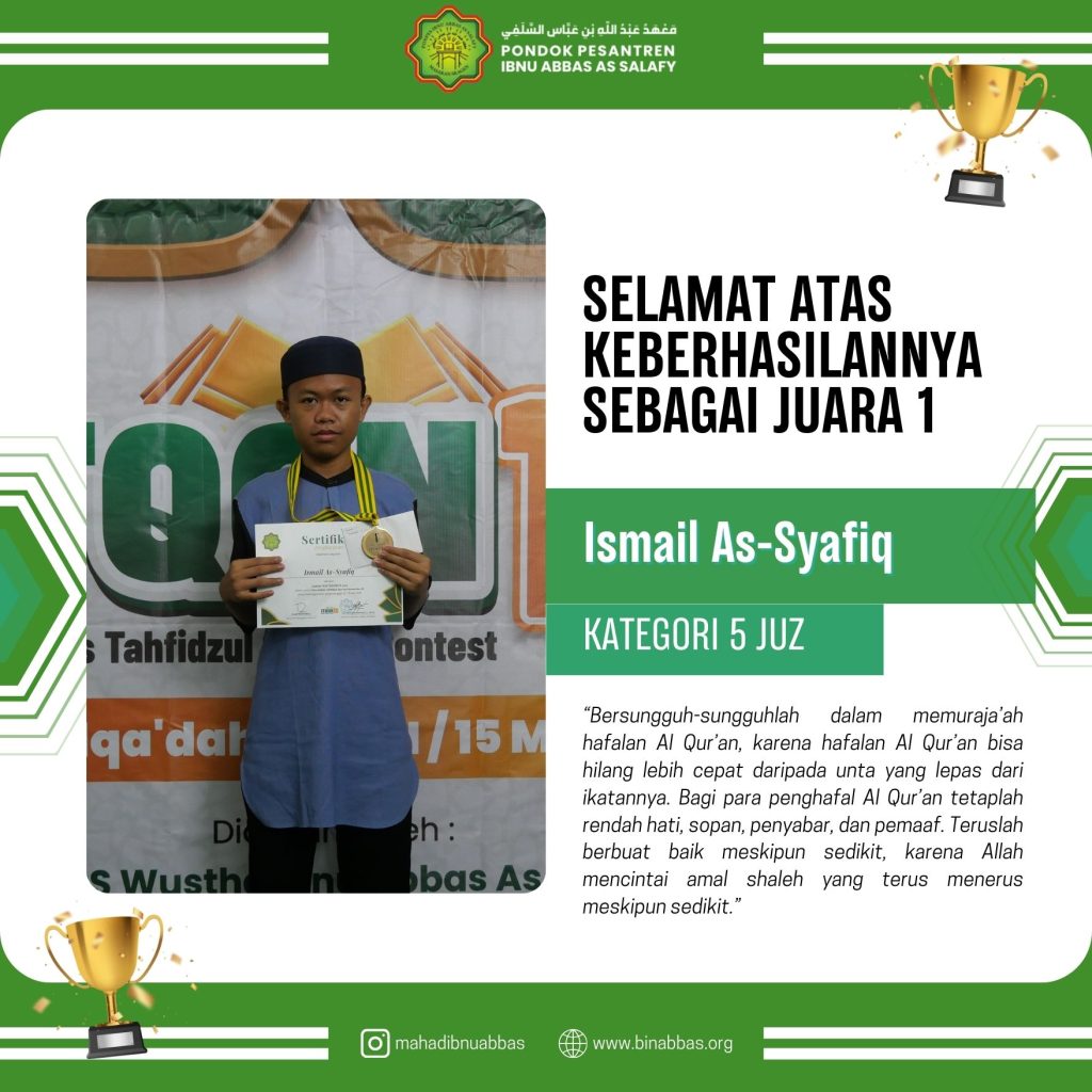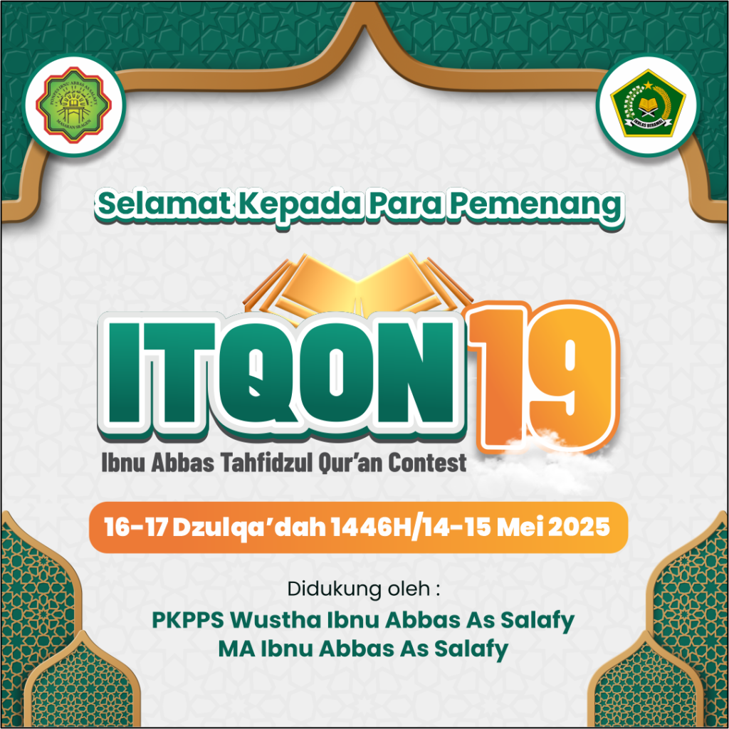 Kamis, 22 Mei 2025 — Pondok Pesantren Ibnu Abbas As-Salafy secara resmi mengumumkan 13 peserta terbaik dari ajang tahunan ITQON ke-19 yang telah diselenggarakan dengan penuh semangat dan antusiasme.