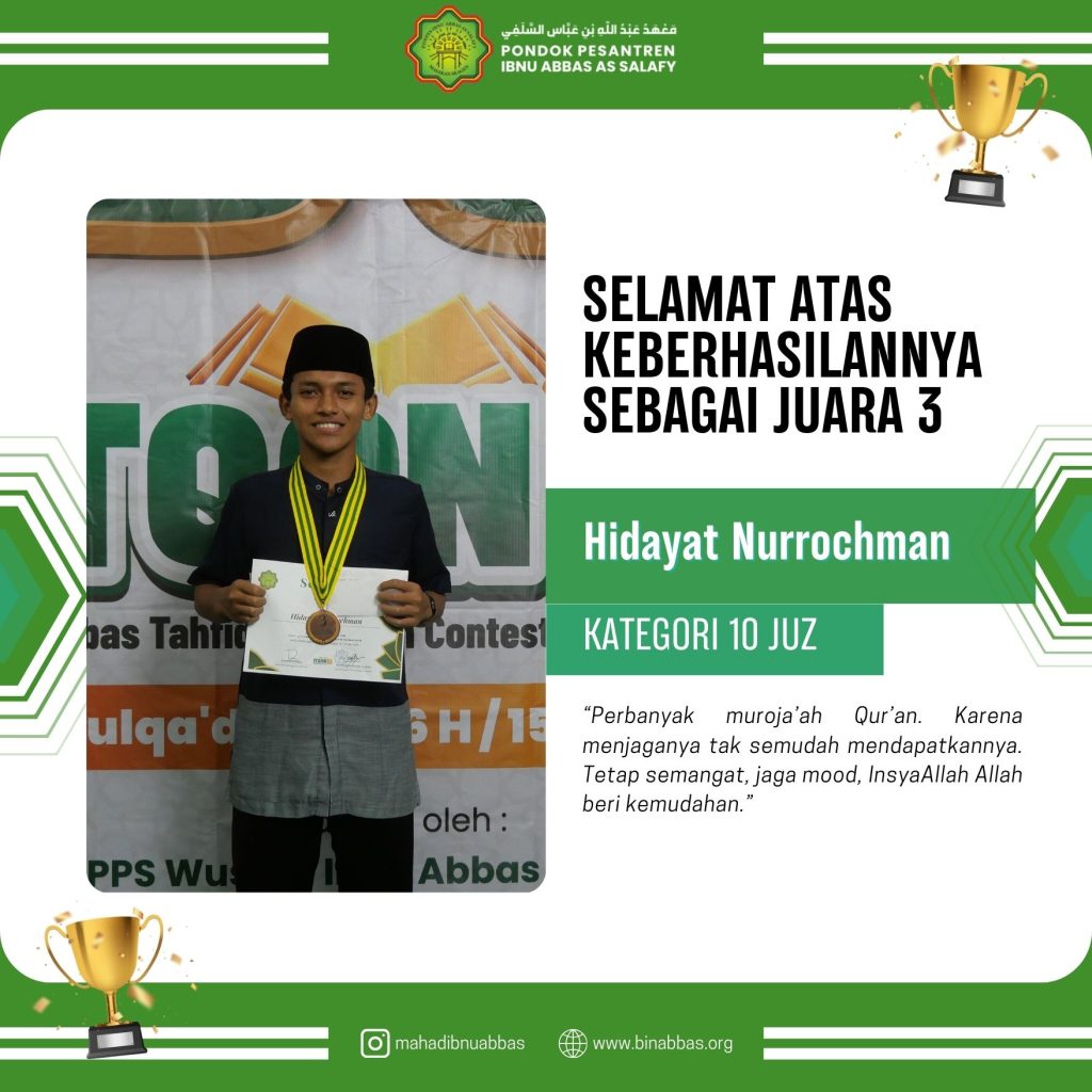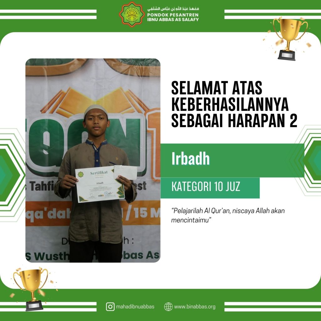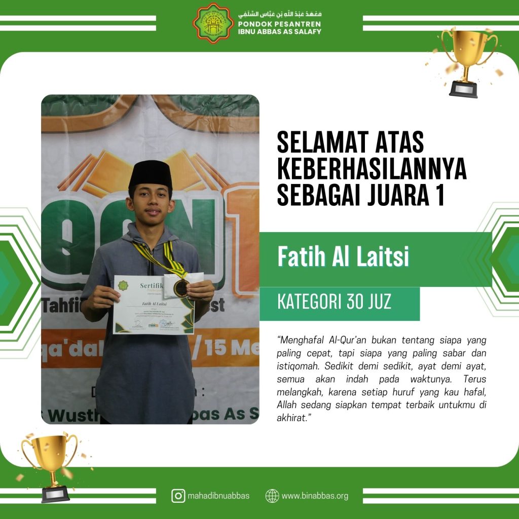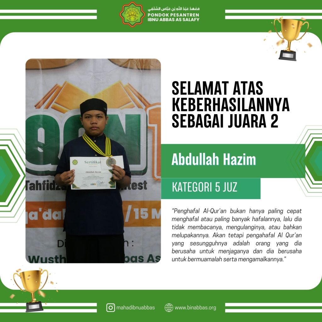 ITQON (Ibnu Abbas Tahfidzul Qur’an Contest), sebagai ajang lomba tahfizh Al-Qur’an tingkat internal pondok, menjadi wadah untuk mengasah kemampuan para santri dalam menjaga dan mengamalkan Kalamullah. Melalui seleksi ketat dan proses yang panjang, para peserta menunjukkan dedikasi luar biasa dalam menghafal, memurajaah, serta memperbaiki bacaan Al-Qur’an mereka.