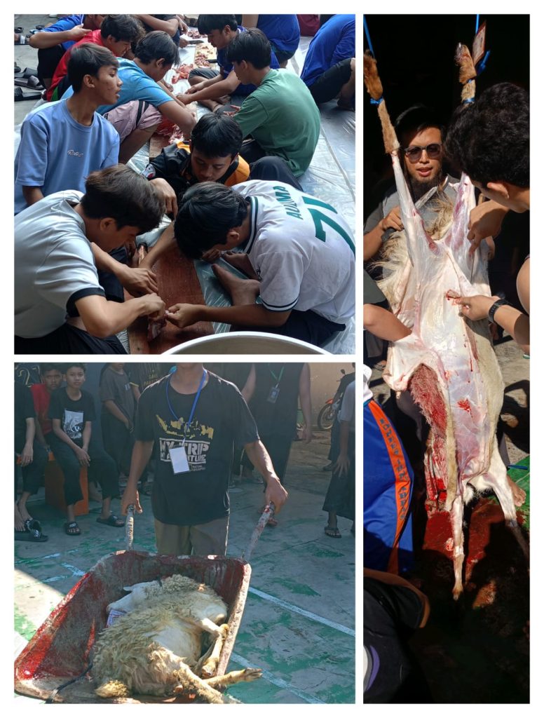 Kegiatan ini merupakan salah satu rangkaian ibadah pada Hari Raya Idul Adha, di mana hewan qurban disembelih dan dagingnya dibagikan kepada yang berhak.- Nyate bareng santri